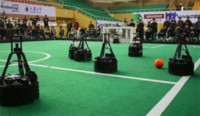 在ROBOCUP比賽中技術含量最高、參賽隊伍最多、競爭最為激烈的中型組足球機器人比賽中,廣茂達公司AS-RO機器人表現(xiàn)十分出色,9場比賽失一球,進70多球,以全勝的驚人成績,斬獲中型組桂冠,AS-RO機器人明年將代表中國參加在新加坡舉行的ROBOCUP世界杯賽。