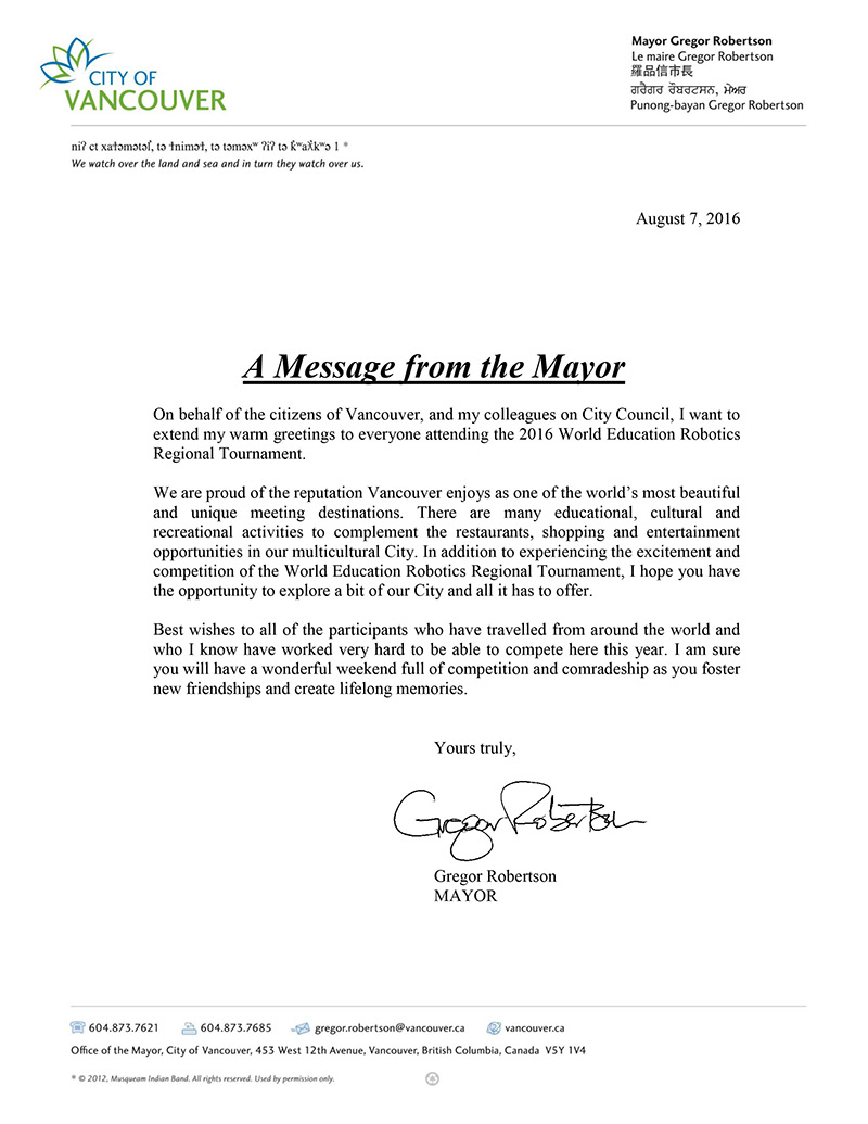 溫哥華市長Gregor Robertson 先生發(fā)來賀信