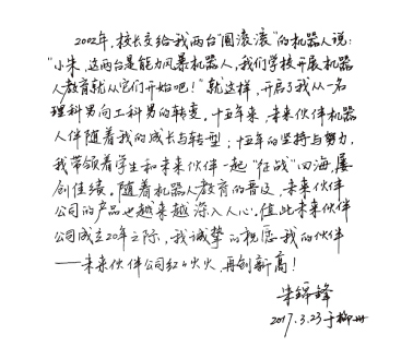 1996 年,中國剛剛擁有互聯(lián)網(wǎng),但還沒有幾個人真正的使用過互聯(lián)網(wǎng)。同年,在上海漕河涇一間22 平米的小小辦公室里,惲為民博士開啟了機器人的研究,也開啟了他為人人擁有伙伴機器人夢想而奮斗的征程,這就是最初的上海未來伙伴機器人有限公司。 20年間,無數(shù)的人工智能公司前赴后繼的倒下了,而未來伙伴也曾歷經(jīng)寒冬,但終迎來了大展宏圖的春天,也因此成為國內(nèi)最“長壽”的機器人公司之一。 20年間,未來伙伴始終聚焦教育機器人,創(chuàng)造并培育了這個全新的市場,并一直引領著行業(yè)的發(fā)展。